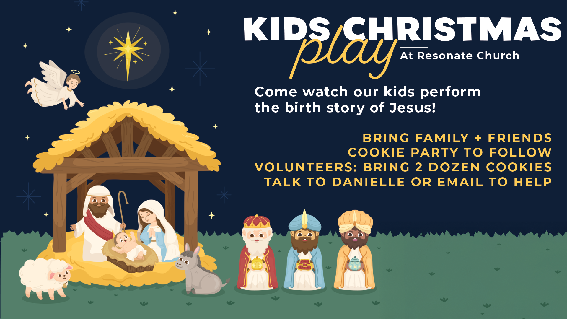 Please join us for our Kids Christmas Play! Bring friends, family, neighbors — everyone is welcome. Our kids will perform the birth story of Jesus on Danielle Boultinghouse’s all-kids Christmas…